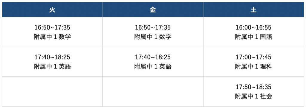 2025年度 中1・2生 時間割・料金 入塾金 ¥9,900円(税込) 中1・2生グループ授業 「少人数グループ授業 英数国理社」 ※定員 各クラス6名※現在新中2生は全教科満席となっております。 ※別途、テキスト代がかかります。※施設管理費などはかかりません。 Bluesky